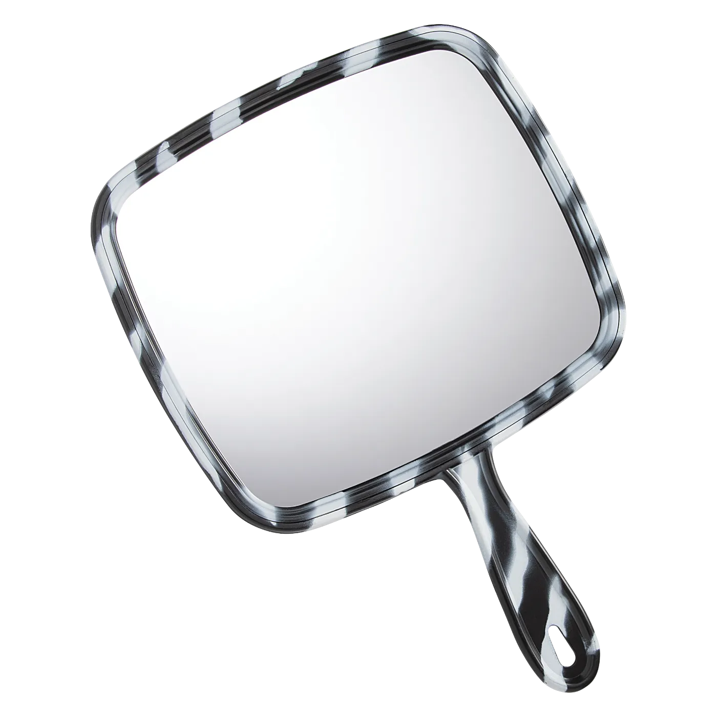 This Soft 'N Style Jumbo Hand Mirror adds a fun, professional touch with a zebra print frame and sturdy handle, perfect for stylists, makeup artists, and estheticians. The large, one-sided rectangular face with rounded edges gives clients a clear view of finished styles from every angle, while the handleÕs hanging hole makes storage simple at any station.
