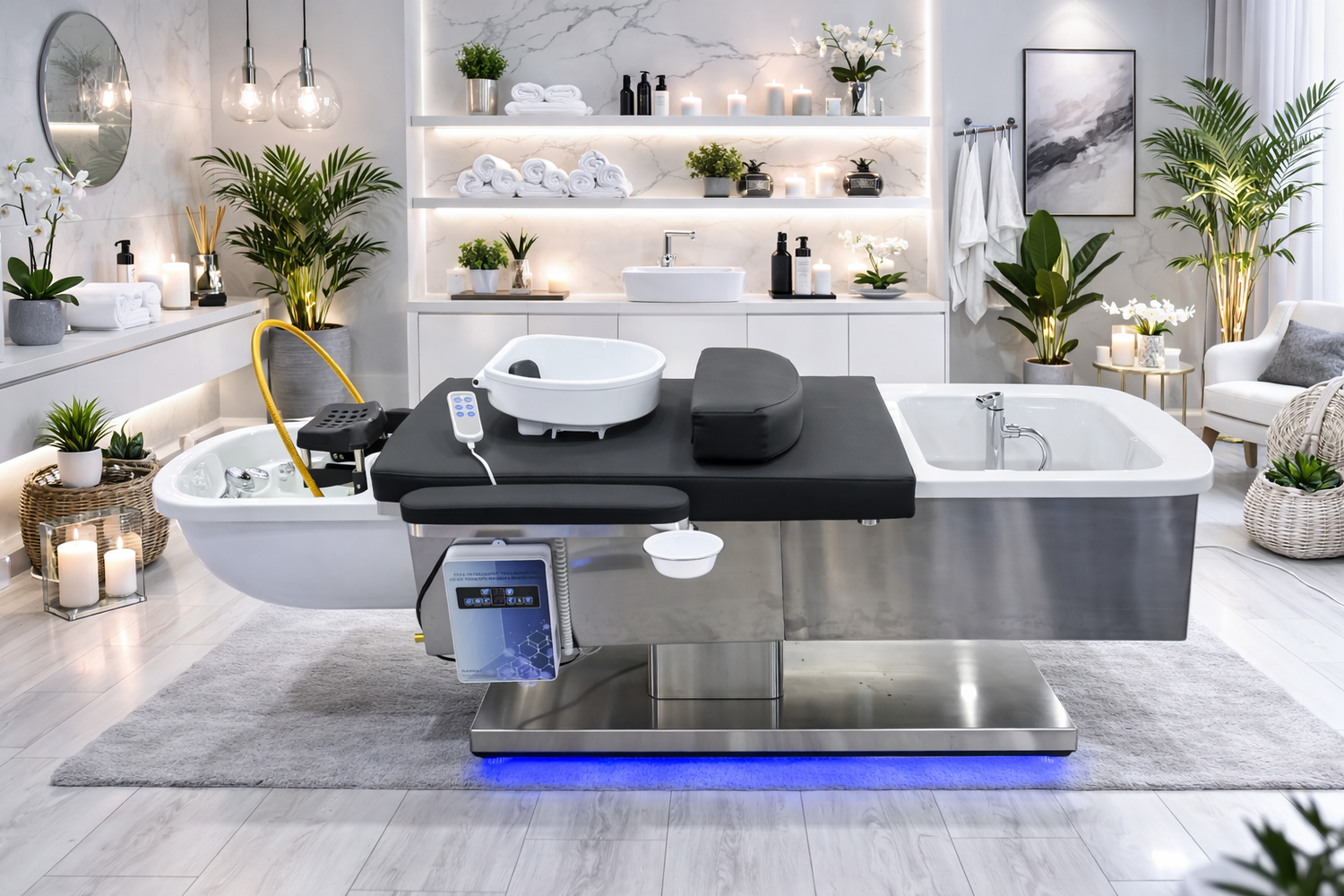 The plumbed SSW M35 Electric Japanese Head Spa Massage Bed is a fully integrated treatment platform for scalp rituals, facials, manicures, and relaxation therapies. A quiet electric lift positions clients with precision, while the plumbed shampoo basin and controlled halo-water circulation deliver consistent pressure and temperature at the scalp. Built-in LED light therapy deepen results, and a dedicated herbal foot basin lets you pair soothing soaks with head-spa services. Contoured PU leather cushioning, manicure nail-soak cups, and a convertible sink cover round out a seamless, spa-grade workflow.